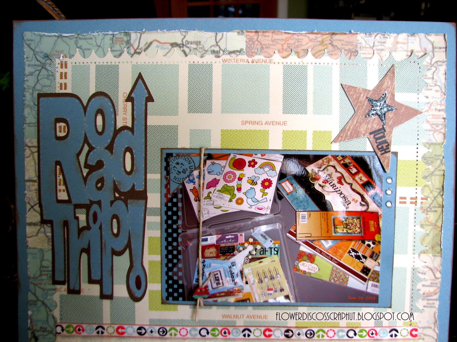 It is a street map patterned paper and the one behind a map patterned paper. I adhered the lace with my glue gun, the ribbon is from American Crafts, the butterflies from punches and the title from the Going Places cricut cartidge.